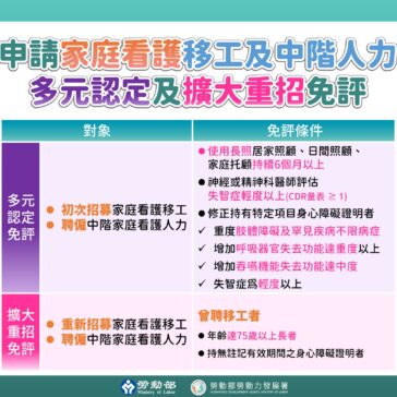 勞動部於今日(10月13日)公告修正申請聘僱家庭看護移工及中階人力相關法規,簡化家庭看護移工申請,增列多元認定申請資格及簡化75歲以上長者及領有特定身心障礙證明 … (繼續閱讀)