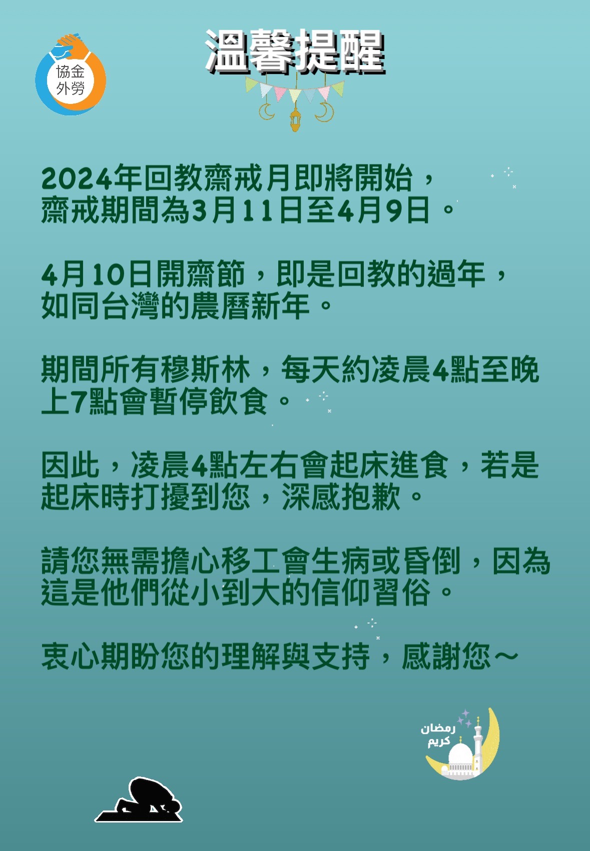 為期一個月的傳統習俗,也請各位移工雇主可以理解