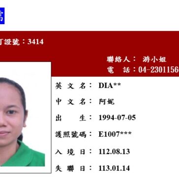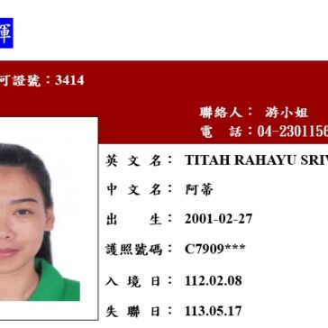 ※懇請協尋逃跑外勞,若查獲請電話通知我司或勞動部通報專線: 0800-000-978。 ※請提醒雇主,勿隨意僱用逃逸外勞,否則會被處以新台幣75萬 … (繼續閱讀)